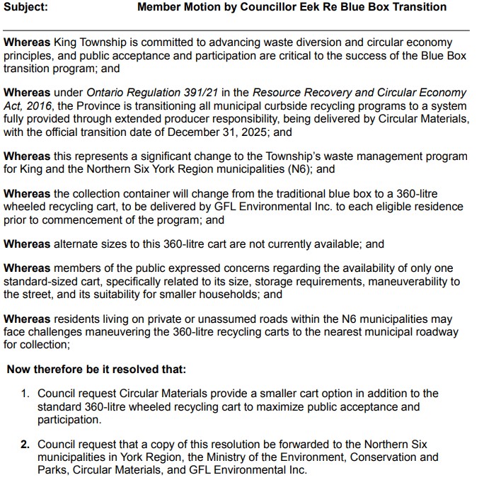 On November 10 Council agenda there is a motion by Councillor Eek and seconded by Mayor Pellegrini regarding the blue box transition. I am totally supportive of the resolution requesting a smaller cart option for recycle materials being picked up by Circular Materials Ontario effective January 1, 2026. As Councillor Eek’s motion says success of the program requires public acceptance and participation but there is concern that the 360 litre wheeled recycling cart (the only one being provided) is problematic.